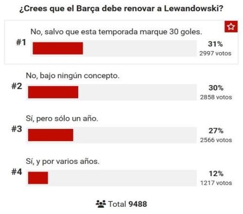 萊萬與巴薩合同明夏到期,《馬卡》報就巴薩是否應該與之續(xù)約發(fā)起網(wǎng)絡調(diào)查,共9488名球迷參與投票,有30%認為無論如何都不續(xù)約—— ①不,除非他本賽季打進30球 31% ②不,任何情況下都不 30% ③是,但只續(xù)一年 27% ④是,續(xù)約好幾年 12% 本季迄今,萊萬為巴薩出場9次打入4球,其中4次首發(fā),共出場431分鐘。據(jù)西媒報道,萊萬首選留在巴薩,至少留在歐洲,暫不考慮前往沙特、美國。而如果萊萬離隊,巴薩希望免簽弗拉霍維奇,而馬競、米蘭、尤文有意免簽萊萬。