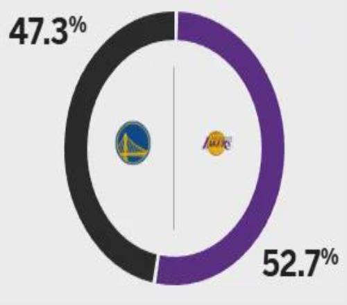 賽前,ESPN對(duì)本場(chǎng)比賽進(jìn)行了預(yù)測(cè):缺少了詹姆斯的湖人仍是更被看好的一方,勝率52.7%,而勇士為47.3%。