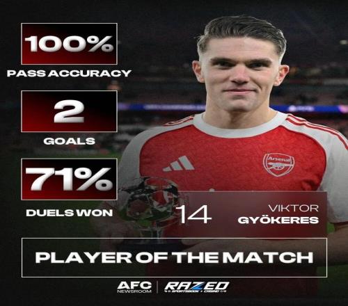 北京時(shí)間10月22日,歐冠聯(lián)賽就階段第3輪首個(gè)比賽日,排名英超榜首的阿森納坐鎮(zhèn)主場(chǎng)4-0痛擊馬競(jìng),歐冠開局豪取三連勝且0失球,暫居第3位。上半場(chǎng)比賽,雙方互交白卷。下半場(chǎng)槍手主場(chǎng)發(fā)力,加布里埃爾利用角球首開紀(jì)錄,馬丁內(nèi)利擴(kuò)大比分,瑞典前鋒約克雷斯梅開二度,終結(jié)個(gè)人7場(chǎng)球荒。賽后,約克雷斯憑借攻防兩端的出色發(fā)揮,成功當(dāng)選歐足聯(lián)評(píng)選的全場(chǎng)最佳。