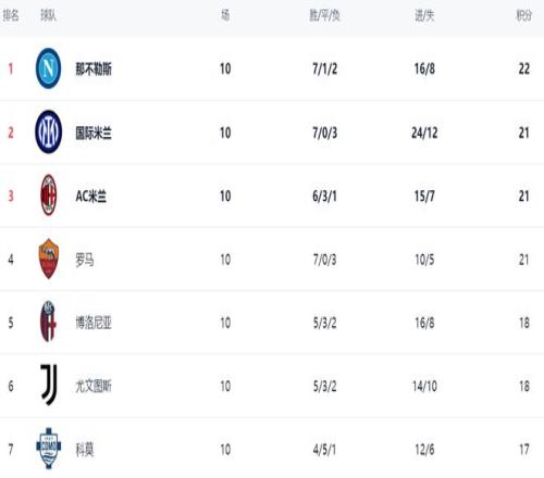 在積分榜上,那不勒斯依然占據(jù)榜首位置。那不勒斯7勝1平2負(fù),拿到22分。不過,那不勒斯的領(lǐng)先優(yōu)勢很小。國際米蘭、AC米蘭和羅馬都拿到21分。也就是說,前4差距最多只有1分,冠軍的爭奪非常激烈。每輪比賽過后都很可能導(dǎo)致榜首球隊(duì)發(fā)生變化。博洛尼亞和尤文圖斯都是18分,排名第5和第6。法布雷加斯率領(lǐng)的科莫拿到17分,排名第7。