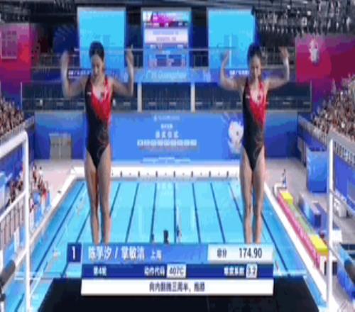 第三跳107b動作上,陳芋汐和掌敏潔仍然保持著同步率驚人的出色發(fā)揮,以174.9分領(lǐng)先第二名近10分繼續(xù)領(lǐng)跑。